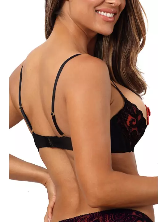 Soutien-gorge ouvert rouge et noir à la fois sensuel et confortable en tulle et dentelle avec un petit nud sur le devant.