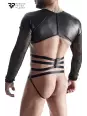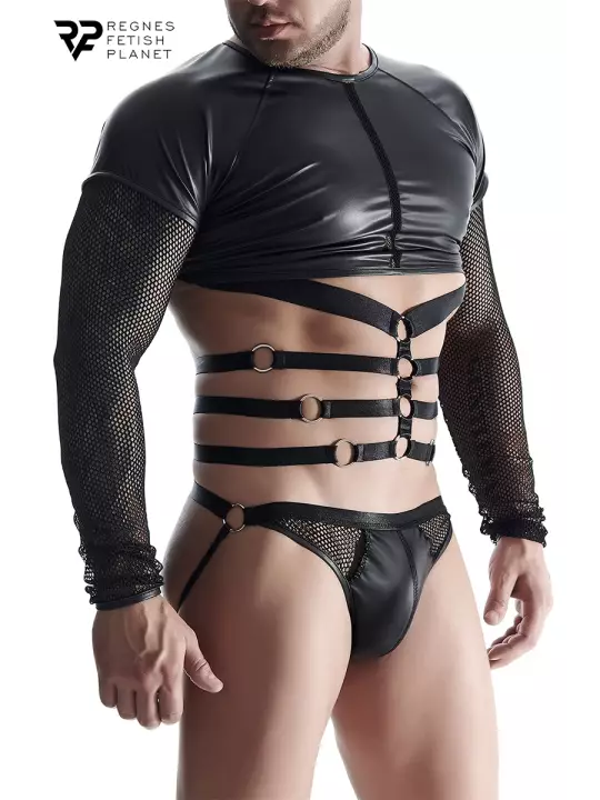 T-shirt à manches longues très original fabriqué en Europe par la marque Regnes. La poitrine et les manches sont fabriquées en tissu effet wetlook. Les manches sont fabriquées en mailles larges dont un rappel est placé tel une ligne verticale à lavant et à l'arrière du t-shirt. Le bas du t-shirt est fabriqué en larges bandes élastiques qui se rejoignent dans les anneaux métallisés pour donner un effet harnais BDSM. Tous ces éléments n'ont qu'un but, mettre le corps masculin en valeur.
